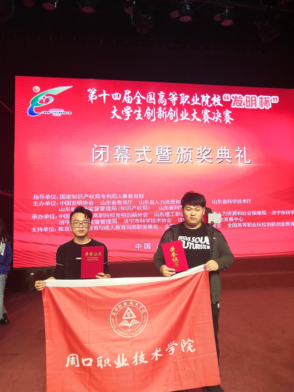 第十四届全国高职院校“发明杯”大学生创新创业大赛决赛于2019年10月25--27日在山东理工职业学院举行。艾弗森贝博ballbet官网发明制作类项目“一种多功能园艺施肥机”在来自全国各地的8264个参赛项目中脱颖而出,获得了一等奖。