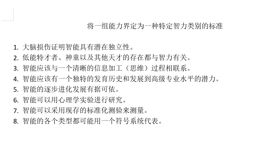 他观察了脑损伤患者,发现人的某些能力由于特定部位的脑损伤而消失或衰退。他还测试了各种不同类型的人,(这些人包括:神童、天才、大脑损伤的患者、低能特才者、普通儿童、普通成人、不同行业的专家以及有着不同文化背景的人。)并且制定了将一组能力界定为一种特定智力类别的标准。