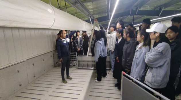 下午,学生到即将投入使用的生猪养殖场进行实地参观。该厂区的厂长就场区养殖规模,专业设备为同学们一一介绍。